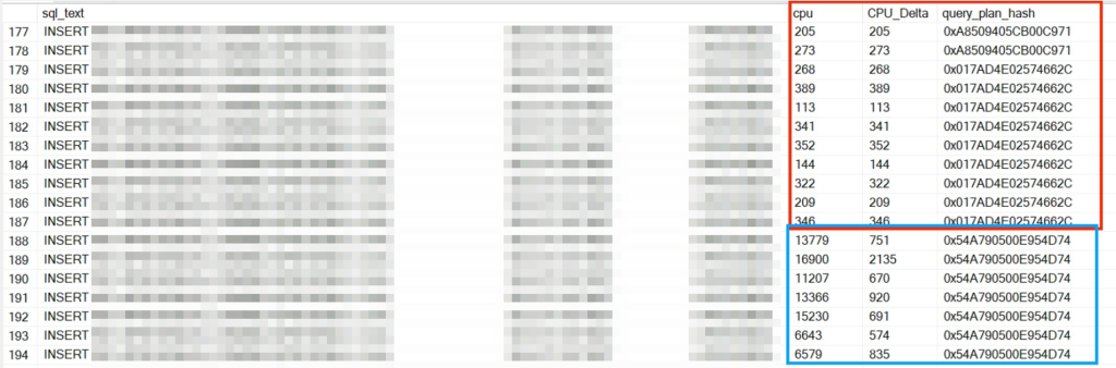A primeira coisa que fizemos foi entender o motivo da mudança repentina no comportamento do ambiente, e isso só foi possível graças à nossa equipe 100% focada. Através dos logs, vimos que, até o dia anterior, a procedure usava um plano de execução específico, mas no dia seguinte começou a usar um plano completamente diferente e pior. O motivo? Um parâmetro que alterou seu comportamento. No print, em vermelho está o plano bom e em azul o plano ruim.